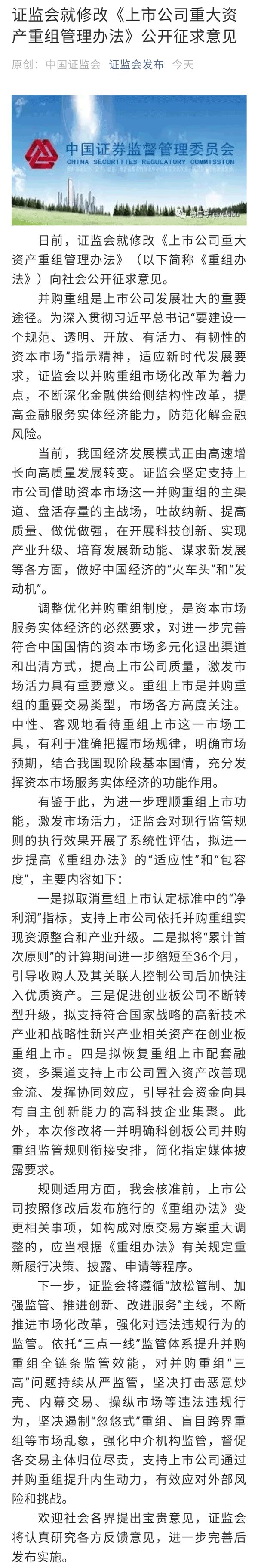 刚刚,中国证监会网站发布一条消息:证监会就修改《上市公司重大资产重组管理办法》公开征求意见。