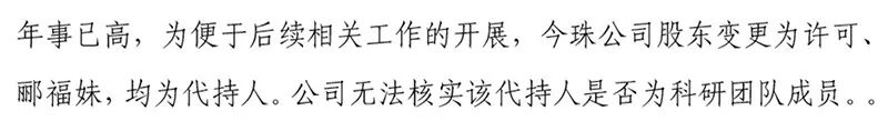 2019年5月份成立公司,许启太不持股;6月11日晚海印股份刊发公告披露了今珠公司后,马上被媒体挖出今珠公司的股权与许启太无关,疑点出现;6月17日,今珠公司紧急实施股东变更,股东变更为许可、郦福妹,均为代持人。但公司无法核实该代持人是否为科研团队成员。