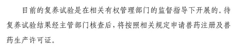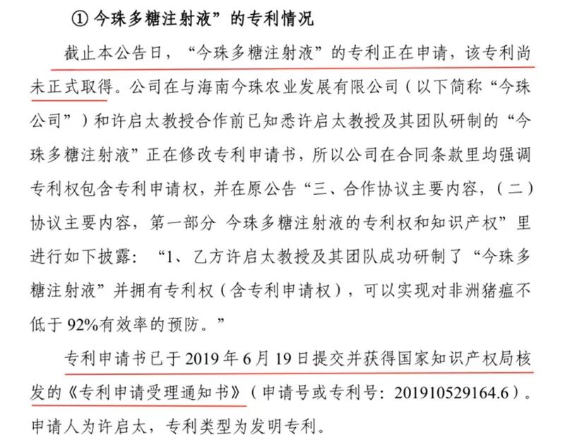 例如前期公告中公司表示,许启太及其团队成功研制了“今珠多糖注射液”并拥有专利权(含专利申请权),可以实现对非洲猪瘟不低于92%有效率的预防;而事实上,92%的有效率并非出自许启太团队,而是来自西班牙学者的研究报告,存在明显的误导性陈述。
