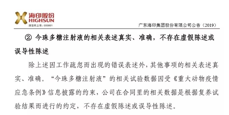 海印股份回复深交所的关注函时表示,除了因工作疏忽而出现的笔误外,其他事项的相关表述真实、准确。“今珠多糖注射液”的相关试验数据因受《重大动物疫情应急条例》信息披露的约束,公司在合同里的相关数据是根据复养试验结果而进行的约定,不存在虚假陈述或误导性陈述。