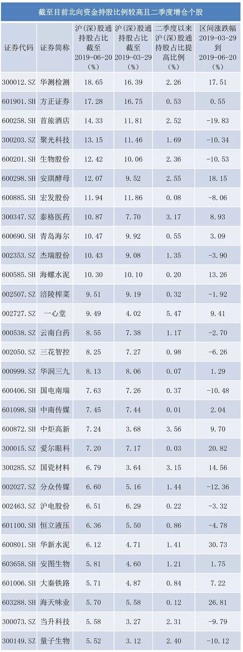 除QFII外,北向资金对部分个股也尤为“钟爱”。以下就是截至6月20日,北向资金持股比例较高且二季度继续增仓的个股。