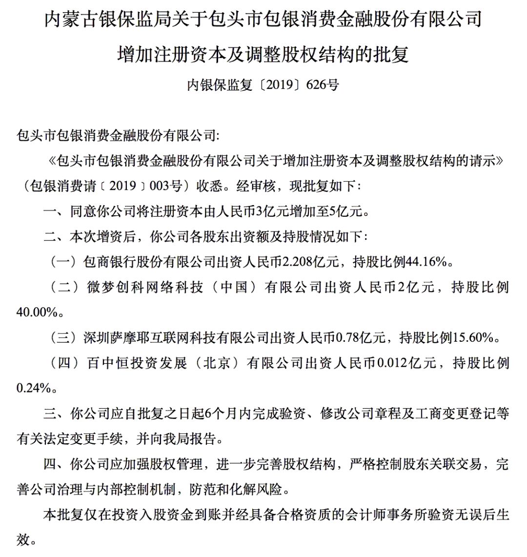 银保监会今日发布的行政许可显示,内蒙古银保监局6月18日批准包银消费金融股份有限公司(下称“包银消费金融”)增加注册资本及调整股权结构,同意公司将注册资本由人民币3亿元增加至5亿元。