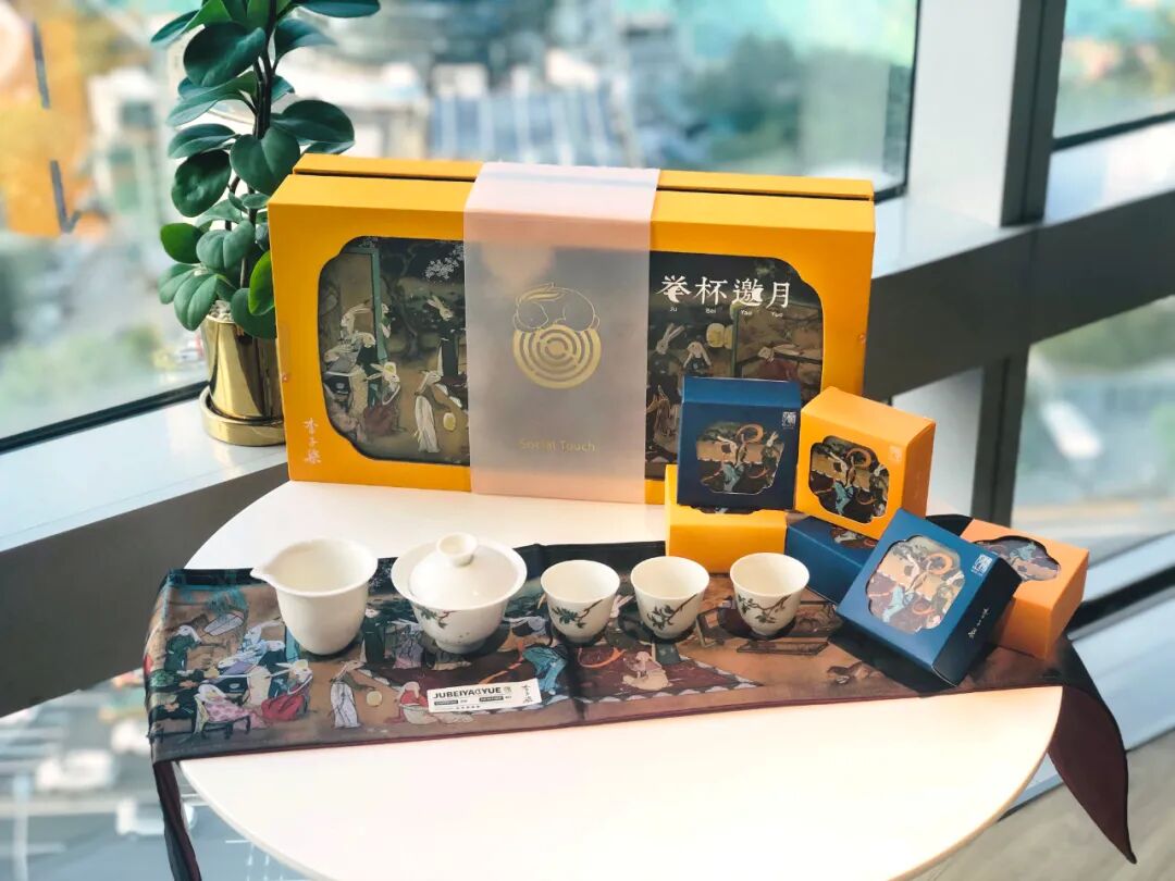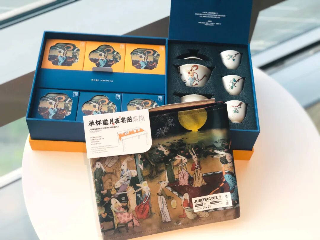时趣的月饼礼盒是李子柒「举杯邀月」的定制款,外观是一幅兔仙版夜宴图,礼盒内还有兔仙夜宴版桌旗和一套精美的茶杯套装,并装有6枚不同口味的月饼。中秋圆夜,再添加一丝茶韵,满满东方味。