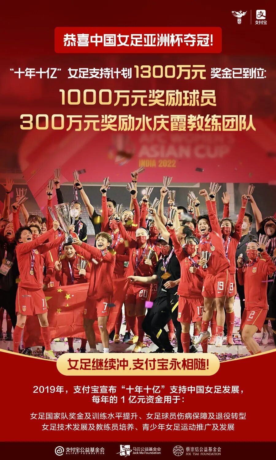 原来,2019年,支付宝宣布“十年十亿”支持中国女足发展,每年的1亿元资金用于中国女足国家队的奖金及训练水平提升、女足球员伤病保障及退役转型、女足技术发展及教练员培养、青少年女足运动推广及发展等。