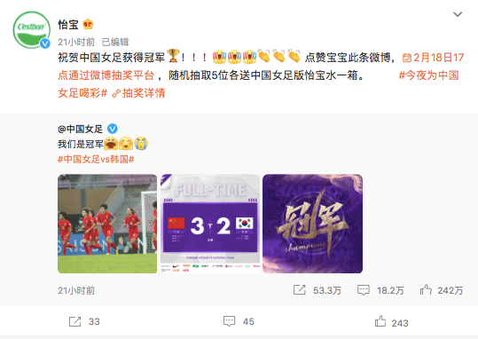 但在女足借势上,可能是精力有限,怡宝的表现一般,就转发了一个抽奖的微博。