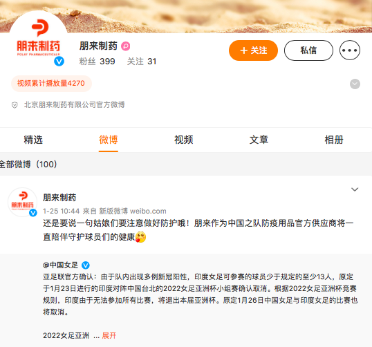 朋来制药是干嘛的呢?从微博发布的内容来看,是做防护用品的,其中,口罩是应该它家的明星产品,据说东京奥运会中国体育代表团的口罩就是他们家的。