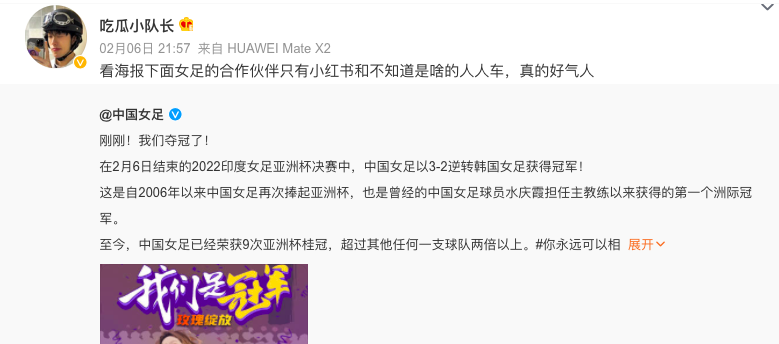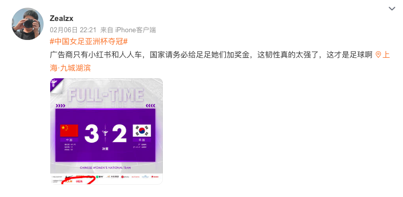 网友也都是极具洞察力,有关女足赞助商的讨论,越来越多,起码从品牌曝光来说,人人车和小红书都赚到了。