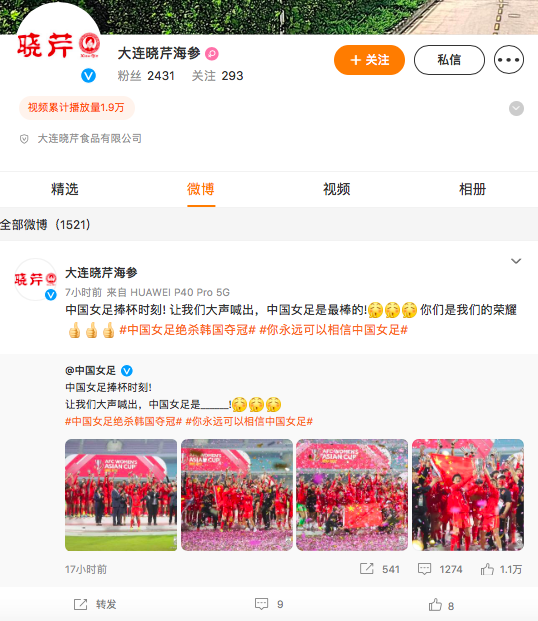 晓芹海参官方微博的粉丝只有2431个,它只是转发了中国女足夺冠的微博,而对于男足吃海参的视频,并未正式回应。
