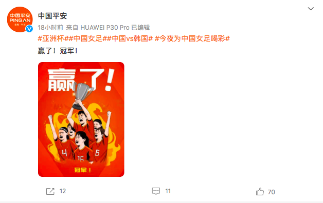 蒙牛和平安都是中国之队的官方赞助商,后者已经连续支持中国女足7年。在女足夺冠后,中国平安官方微博也第一时间发了借势海报,然后,就没有然后了。大叔只能说,有点可惜。