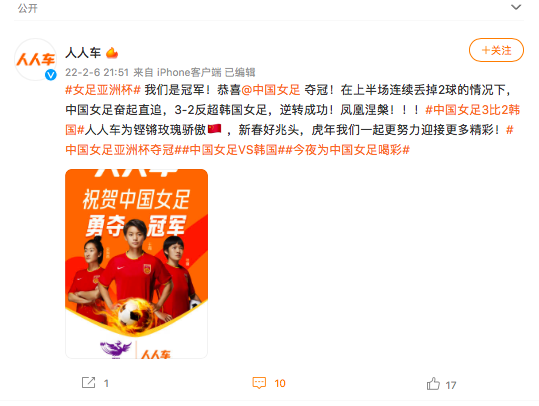 人人车的微博粉丝虽然只有42万,但一直不懈努力,在发女足相关的话题。在女足夺冠之后,@人人车 官方第一时间发布了祝贺海报。