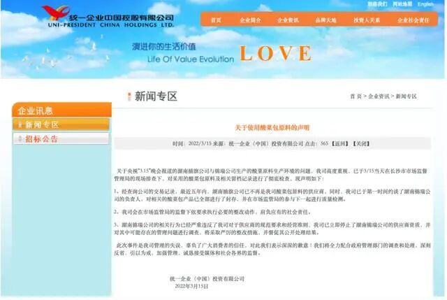 统一算是目前最早有正式回应的企业,来自媒体的报道,声明挂了官网。