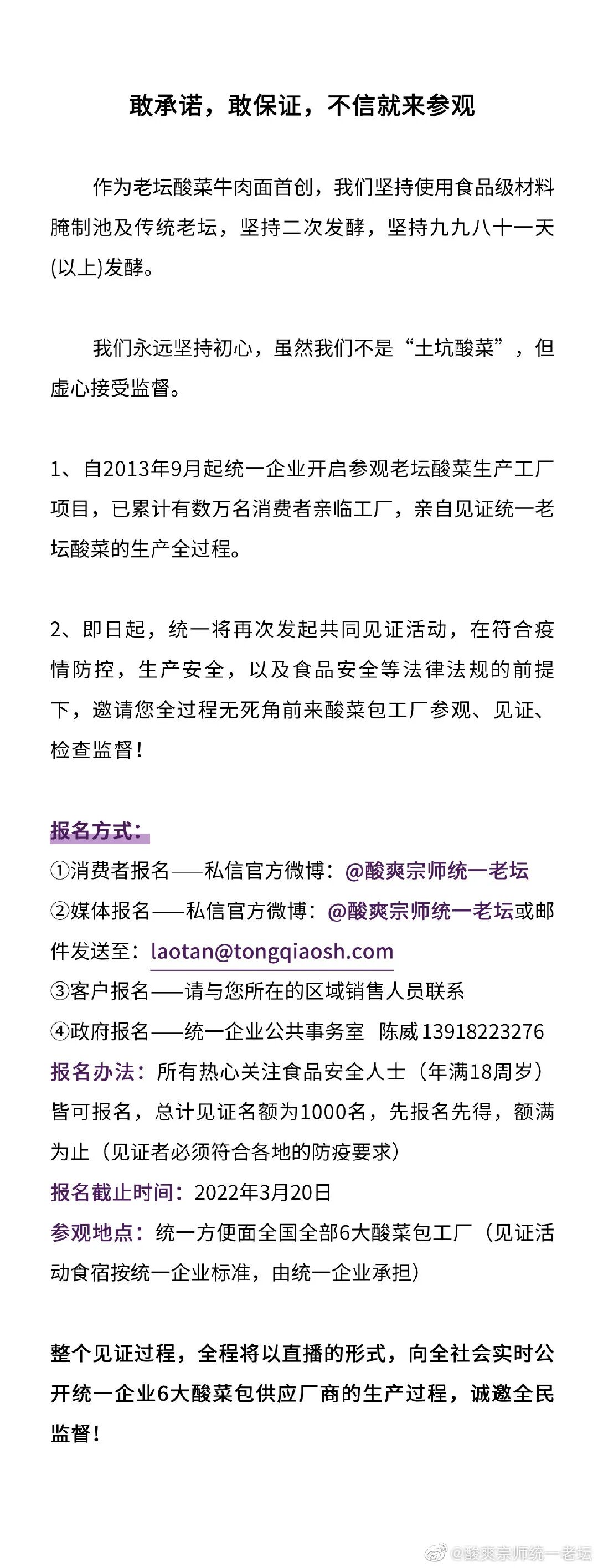 另一条官方微博,则是统一企业要主动邀请1000名媒体朋友、消费者、客户,去统一企业的酸菜加工厂参观,欢迎大家报名!
