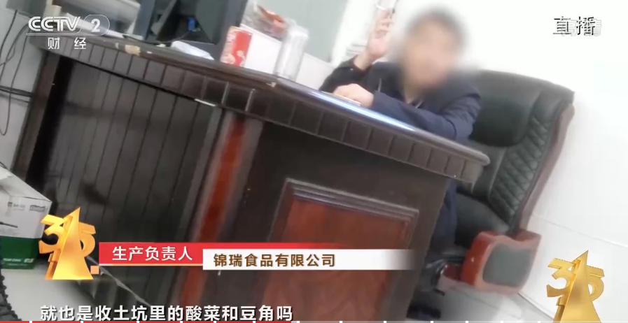 比如央视采访锦瑞食品生产负责人的视频里,记者问:“也是收土坑里的酸菜和豆角嘛?”回复:“我们池子里面不够用啊”。