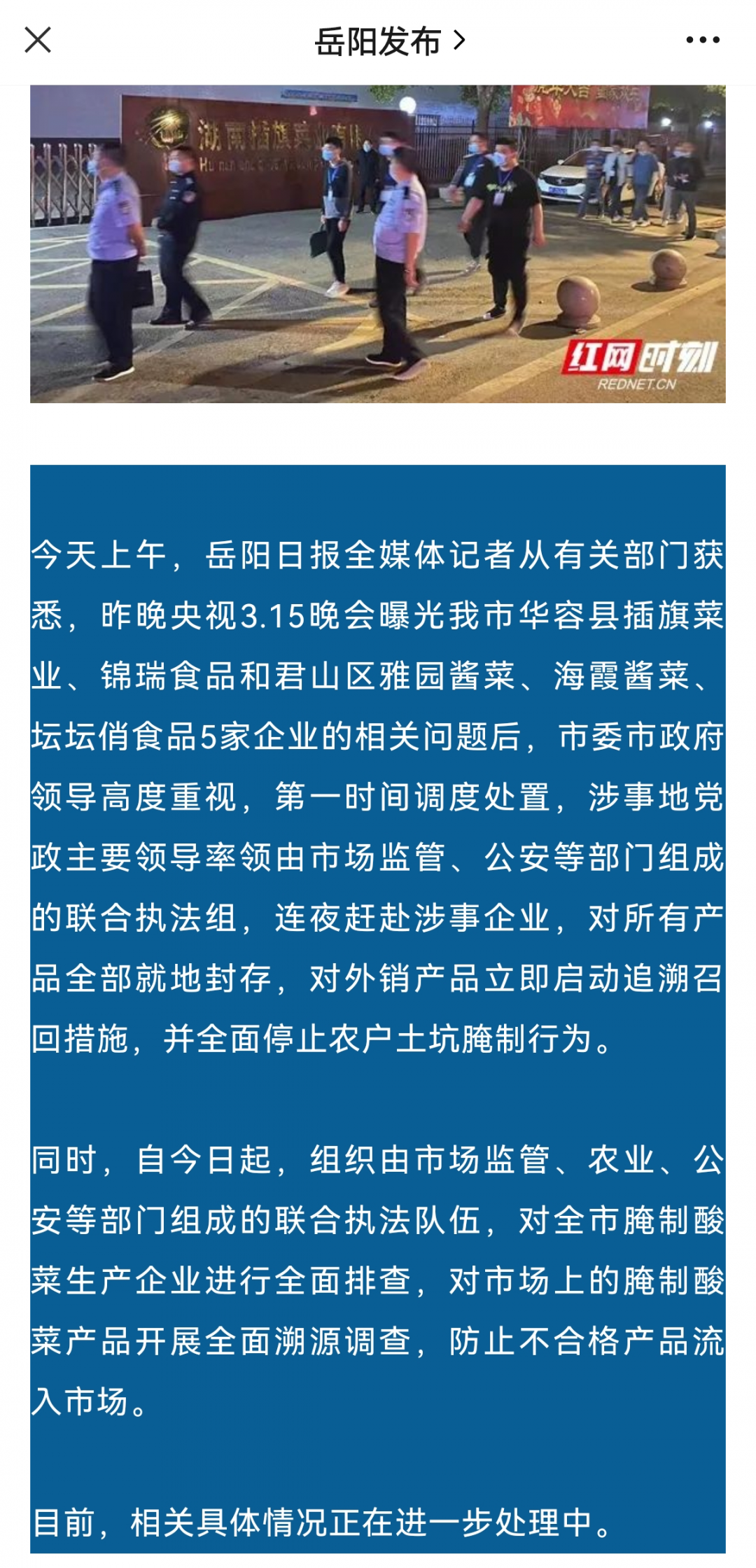 315当晚,涉事地党政主要领导率领由市场监管、公安等部门组成的联合执法组,连夜赶赴涉事企业(包括锦瑞食品),对所有产品全部就地封存,对企业的相关人员予以控制,对外销产品立即启动追溯召回措施,并全面停止农户土坑腌制行为……相关具体情况正在进一步处理中。