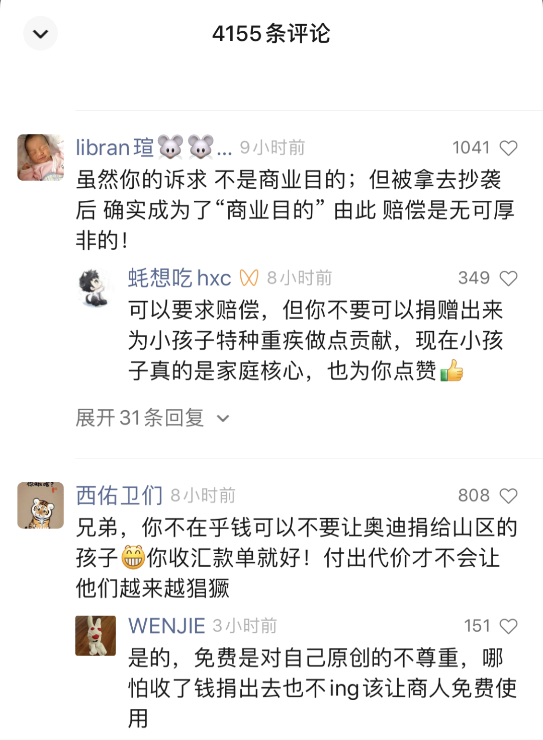 此外,对于网络目前一些少量的“炒作”或者“应该索赔”的质疑,如果奥迪、上思广告和北大满哥这三方不再进行回应,也就不会让此事的热度继续维持了。大叔觉得,三方应该都有这个“自知之明”和意识,包括北大满哥,毕竟对他的“原创性”的质疑声也不断。