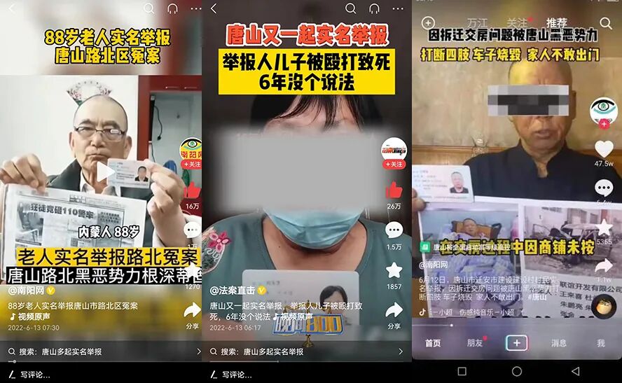 第二,短视频内容实现了“裂变”。多位实名举报黑恶势力的唐山及河北老百姓。大家在镜头面前的动作一致:手持身份证,说出自己的举报内容。