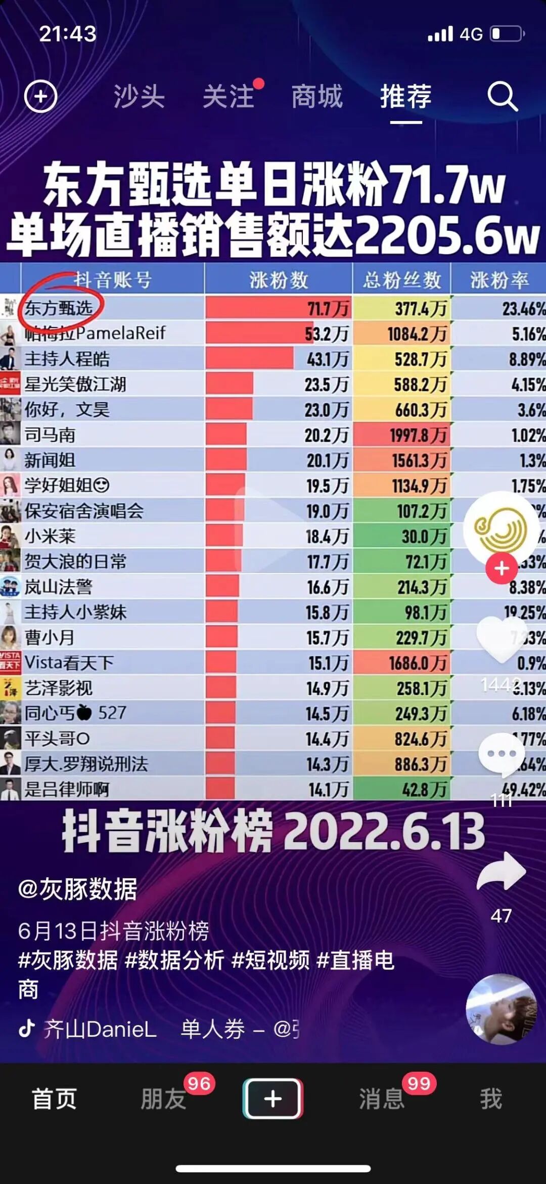 “抖音电商一哥”就此落幕,但抖音电商迫切需要“新一哥”。不知道你这几天打开抖音,是不是刷到很多东方甄选的直播和短视频啊,大叔有2个抖音号,我亲测过,真的很多,就连某号吐槽抖音,“不要老给他推新东方直播间”的短视频,都在2个抖音号刷到了。