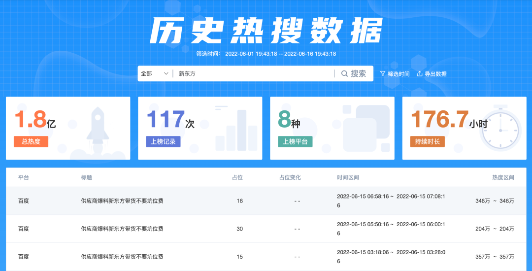 来自壹沓科技数据智能产品的数据显示,从6月1日至16日,短短两周,“新东方”上了8个平台的117个热搜。