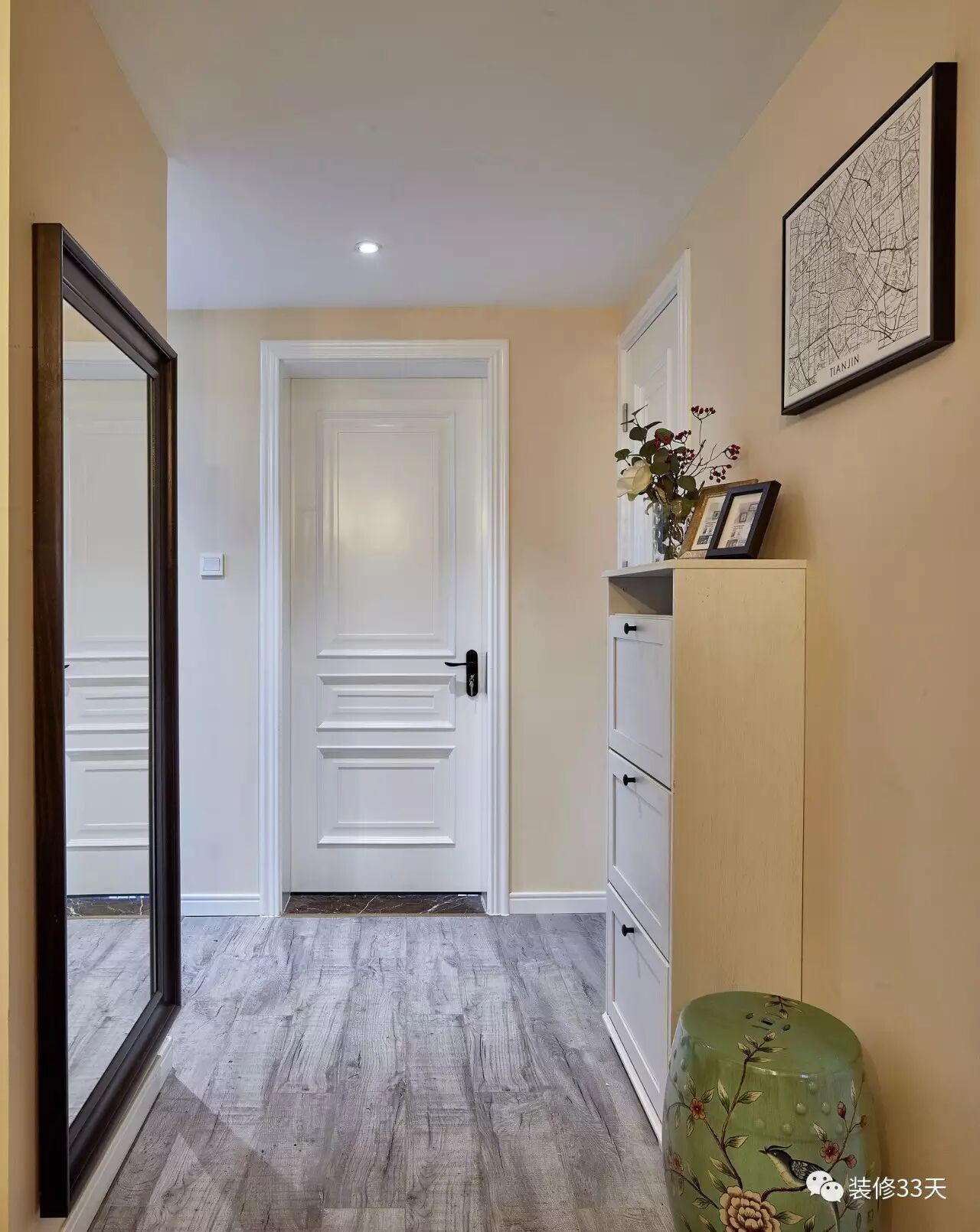 ▲ 建筑面积90平,使用面积70平,造价20万(不含电器),设计师以简约的北欧风结合工业元素,打造出休闲舒适的二居室空间,进门右侧过道空间摆放半高鞋柜,和中式鼓凳构成换鞋区,一面仪容镜,放大视觉空间