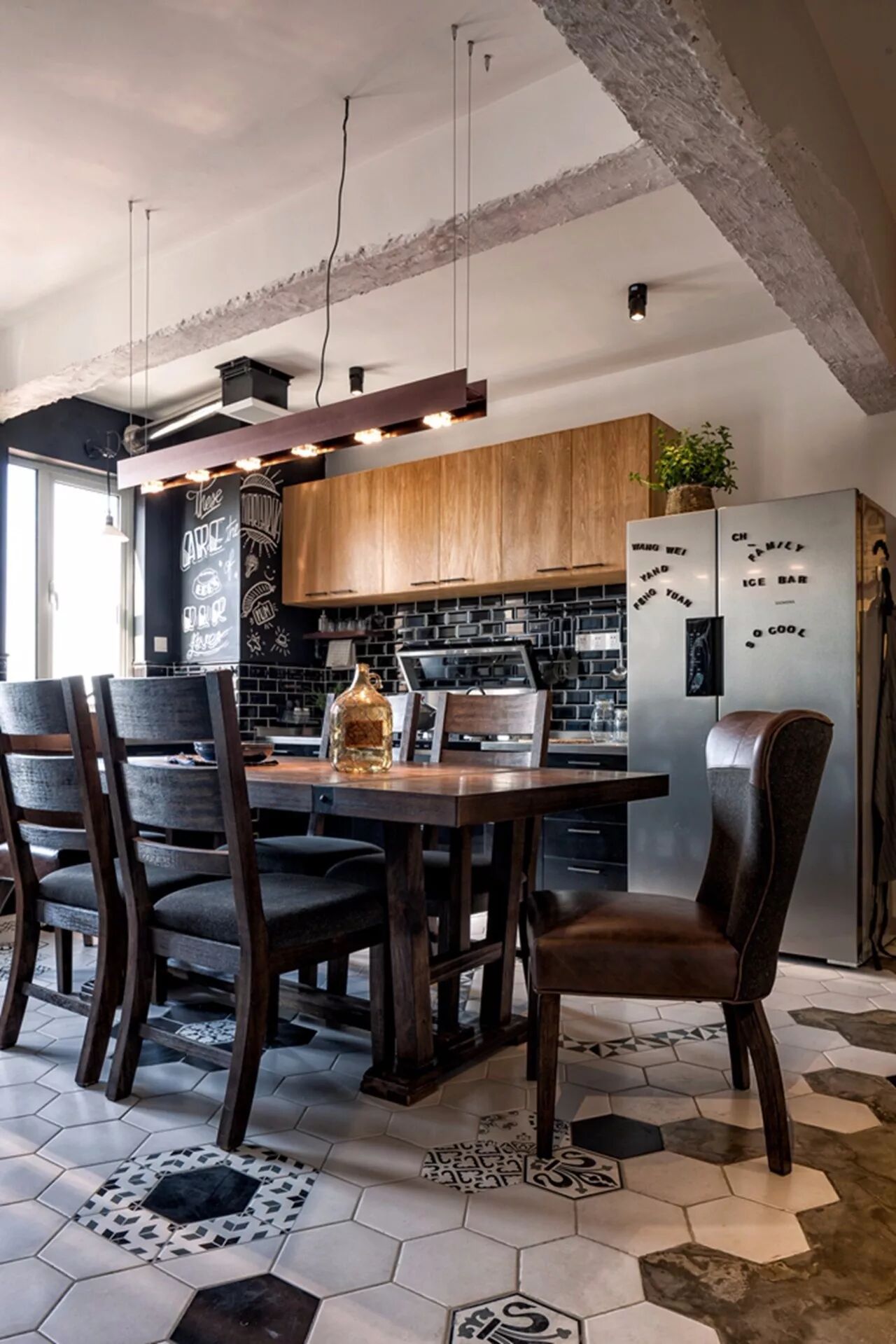 ▲ 从玄关延伸到餐厅的六角砖搭配着水泥地面,将普通的吊顶横梁铲掉表面露出原始面貌,制造出粗狂的视觉效果