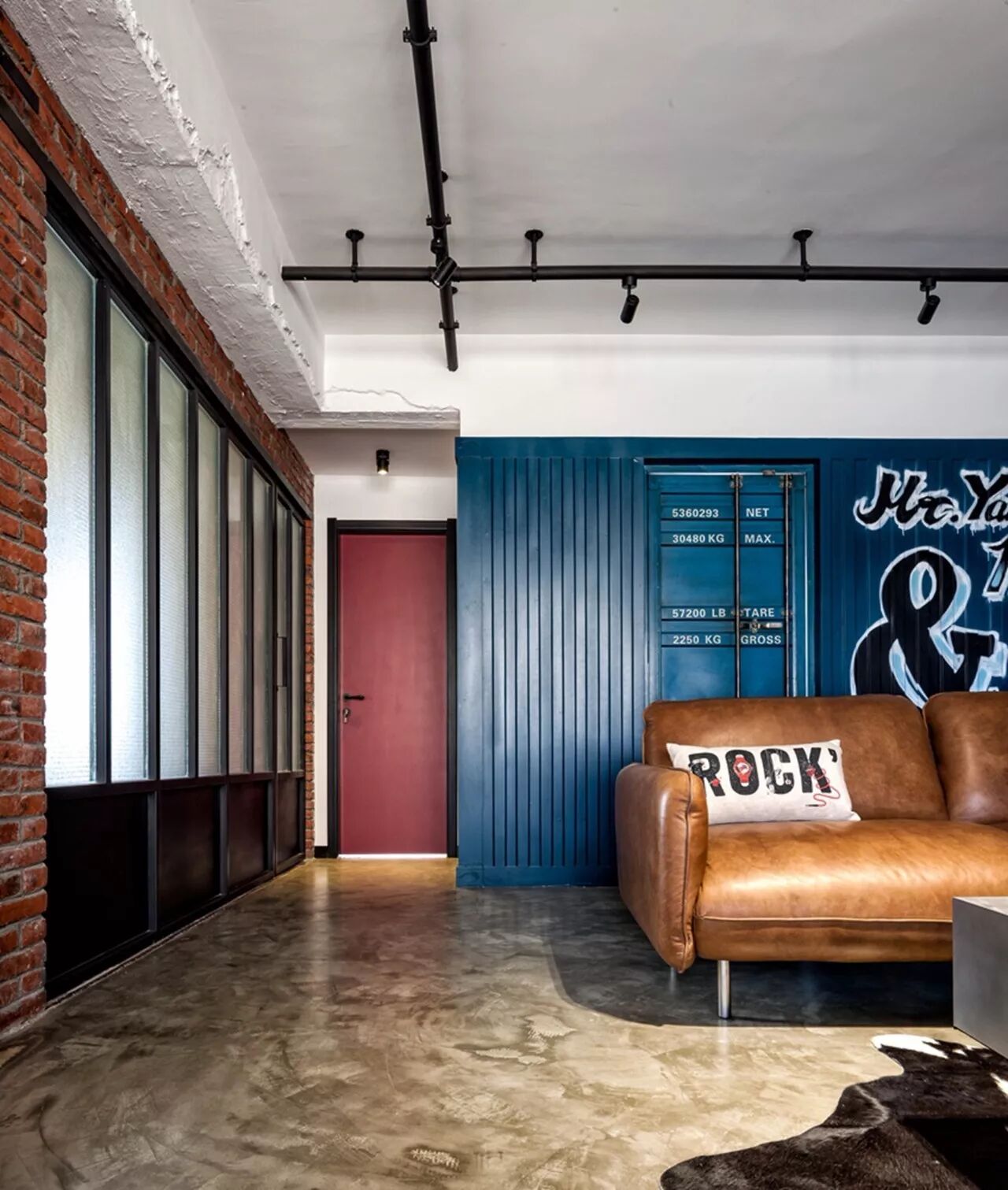 ▲ 沙发背景是木工用板材结合正真的集装箱房门,让墙面有工业铁皮的效果,搭配涂鸦形式的墙绘,集装箱门是儿童房的入口