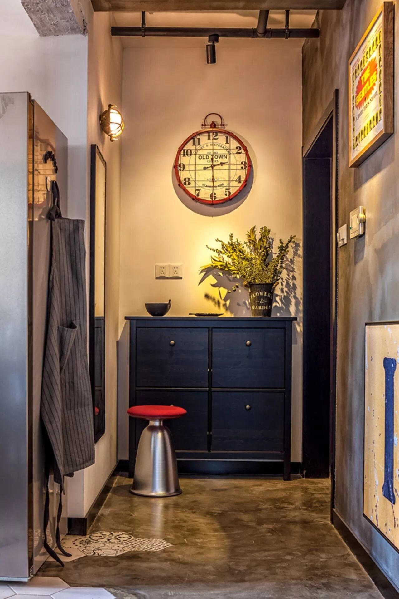 ▲ 建筑面积128平,造价40万(软硬装+家电),业主沉迷于上世纪的革命情怀,设计师以年代气息颇浓的工业风为主题,打造酷劲十足的个性住宅,入户玄关采用六角砖与水泥地完美的结合,铁管射灯,水泥墙面,复古的挂钟,再搭配一把红色的换鞋凳,让空间都活跃起来