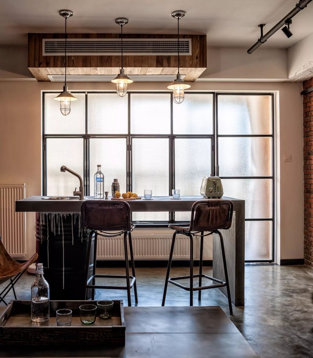 ▲ 客厅设计了个性吧台,融入简单的西厨功能,顶面风管机用防腐木包裹严实,也非常出效果