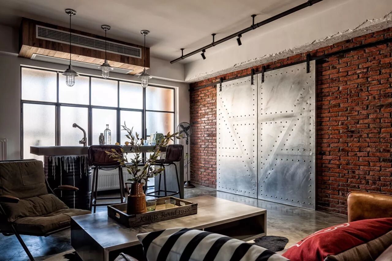 ▲ 整面墙铺贴红砖,赋有年代感,两扇铝制谷仓门,弱化红砖墙的厚重感,散发王者气场
