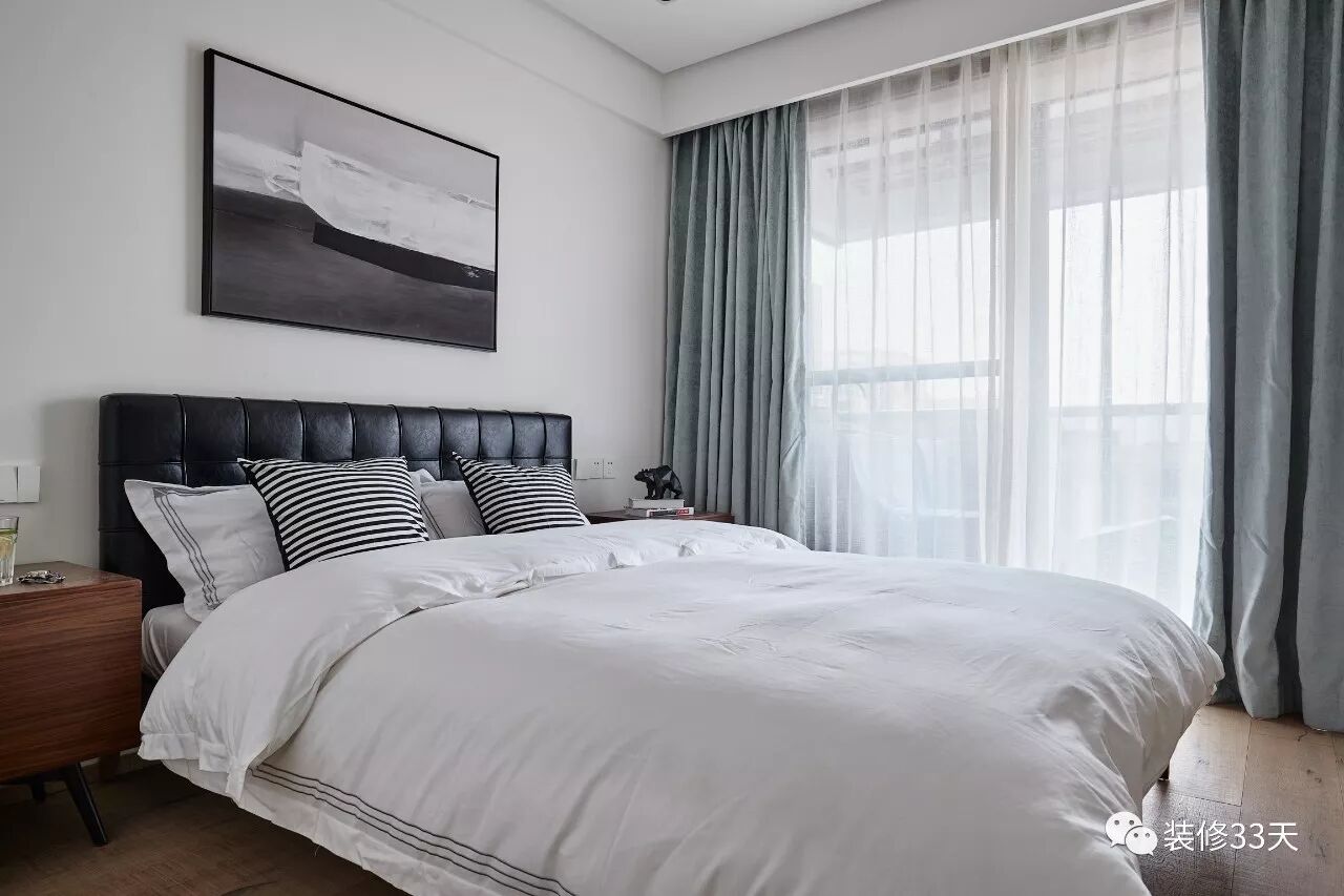 ▲ 次卧木色地面搭配白色乳胶漆墙面,黑白灰与木色调结合现代风格,白色纱帘搭配灰绿色布帘,给空间增添一丝清新感