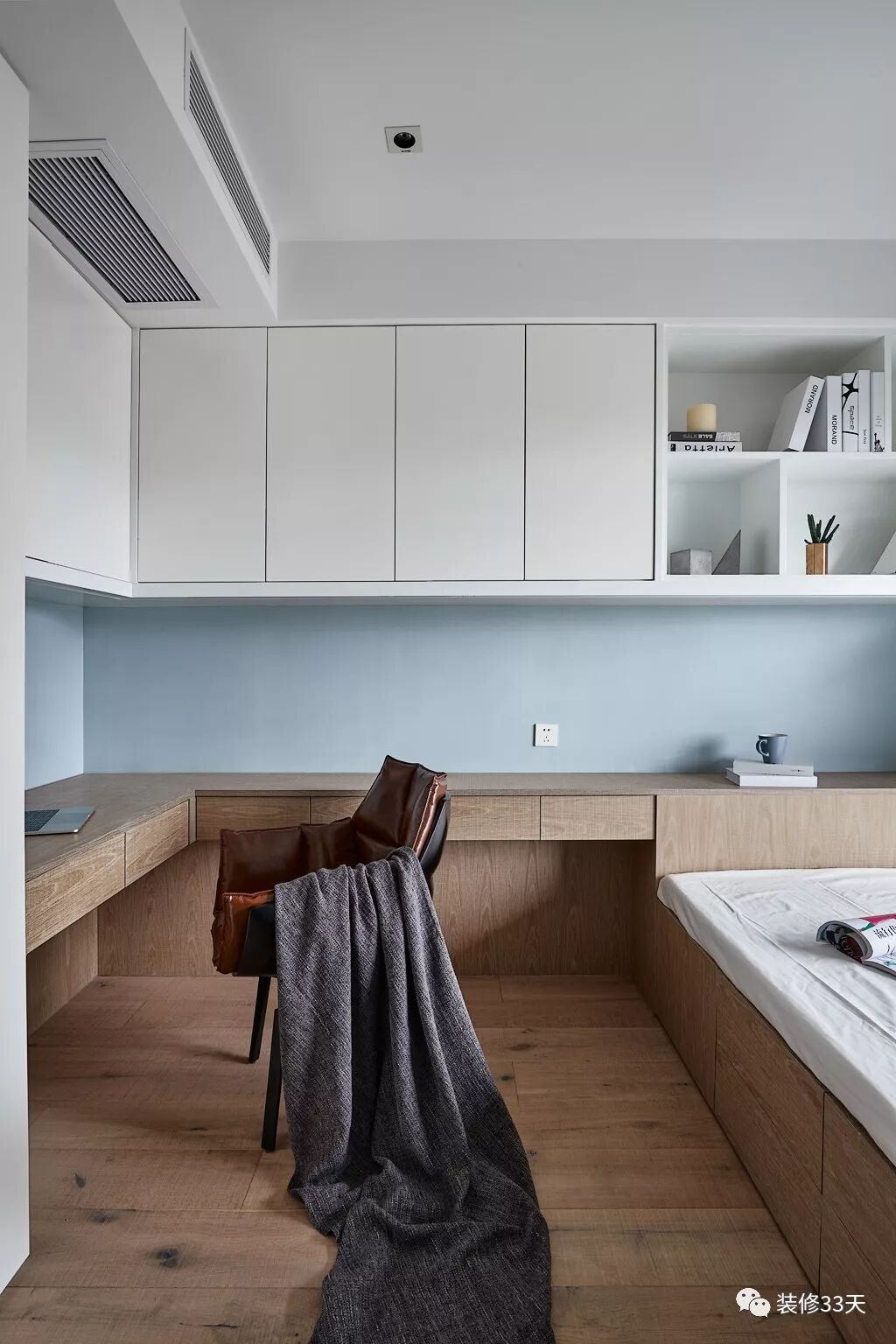 ▲ 多功能房兼具书房与客卧功能,靠窗木作榻榻米床铺,靠墙木作L型书桌及吊柜,将书桌台面延伸到床沿,将台面最大化设计,木色搭配蓝白色系,使空间更加灵动自然