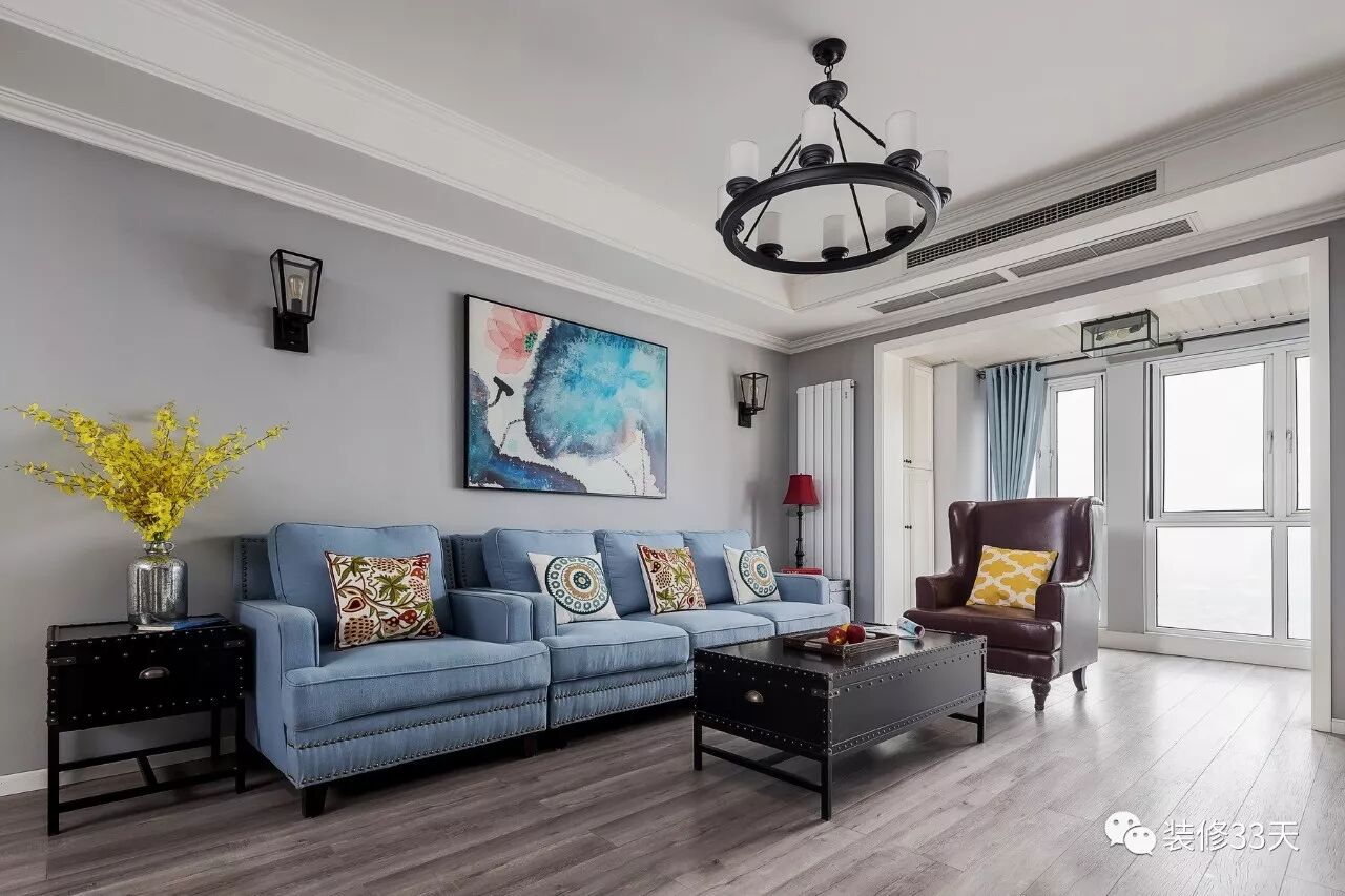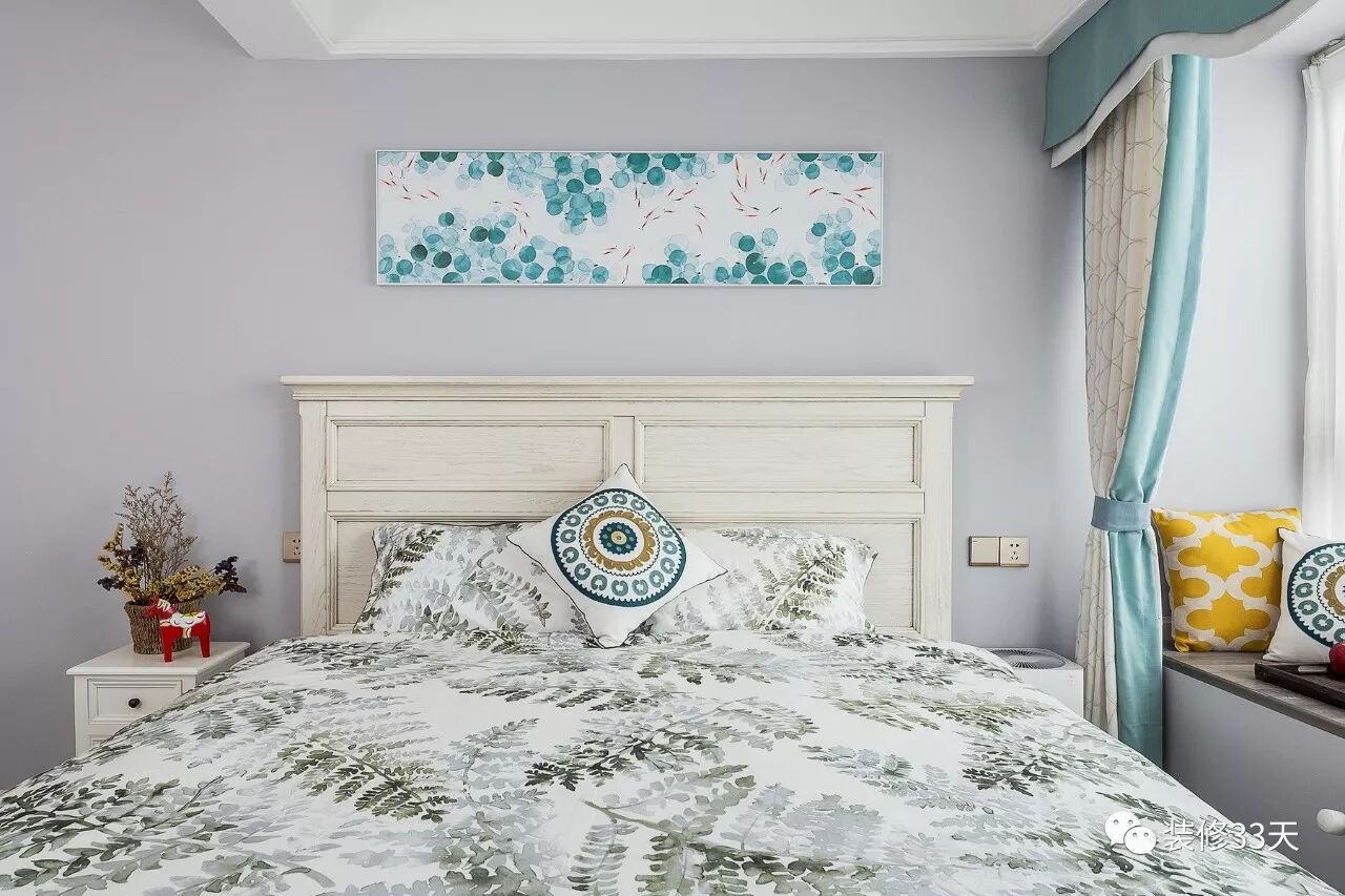 ▲ 主卧延续灰色乳胶漆墙面,搭配蓝色软装与做旧款家具,打造清新美式空间