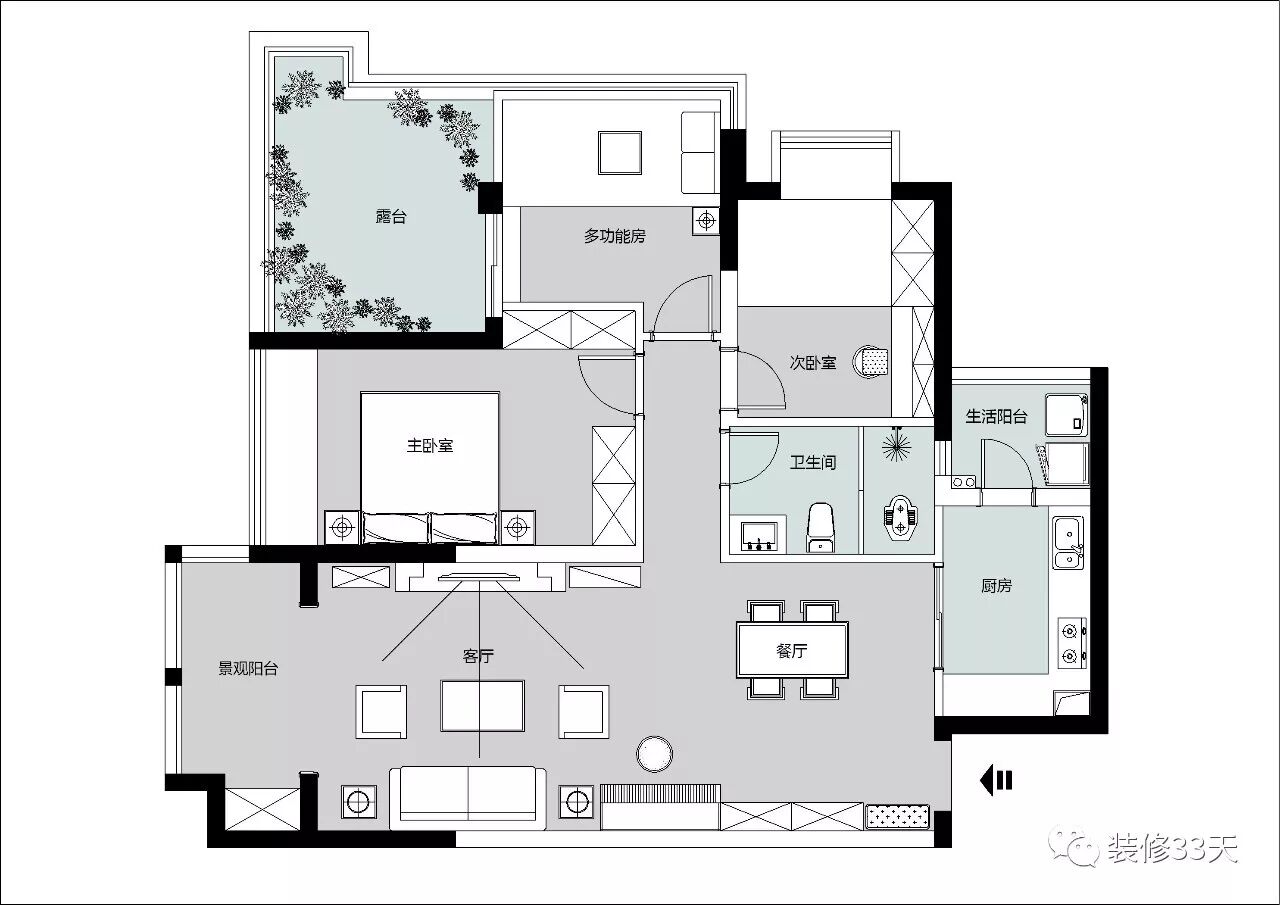 ▲ 多功能房位置上移,利用露台的部分空间,打造出兼具书房与客卧的空间,同时扩大主卧面积
