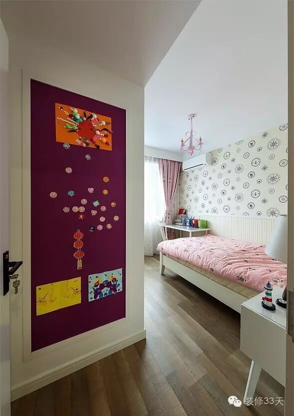 ▲ 儿童房进门设置了一面紫色的黑板墙