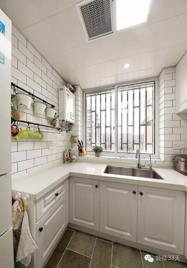 ▲ 厨房用小白砖工字型铺贴,墙面配合黑色挂钩,颜值颇高