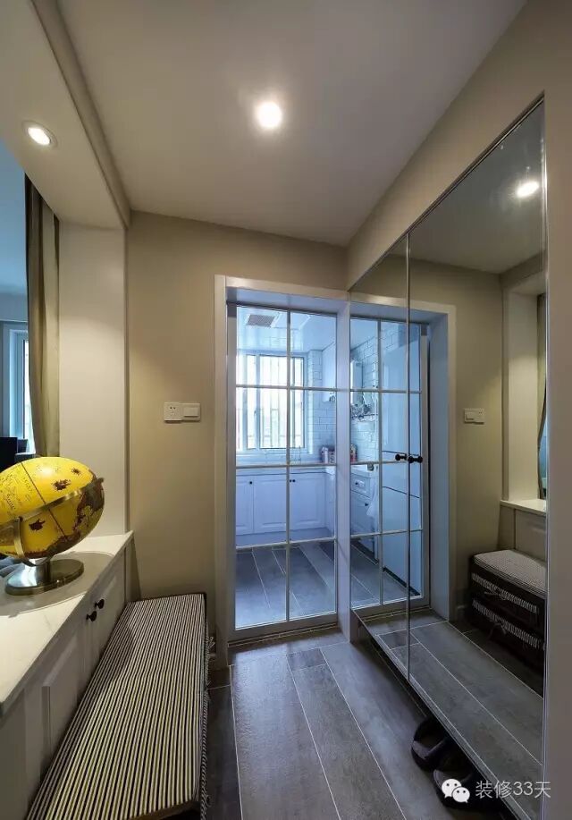 ▲ 进门右手边的厨房门口设计了镜面鞋柜和换鞋凳