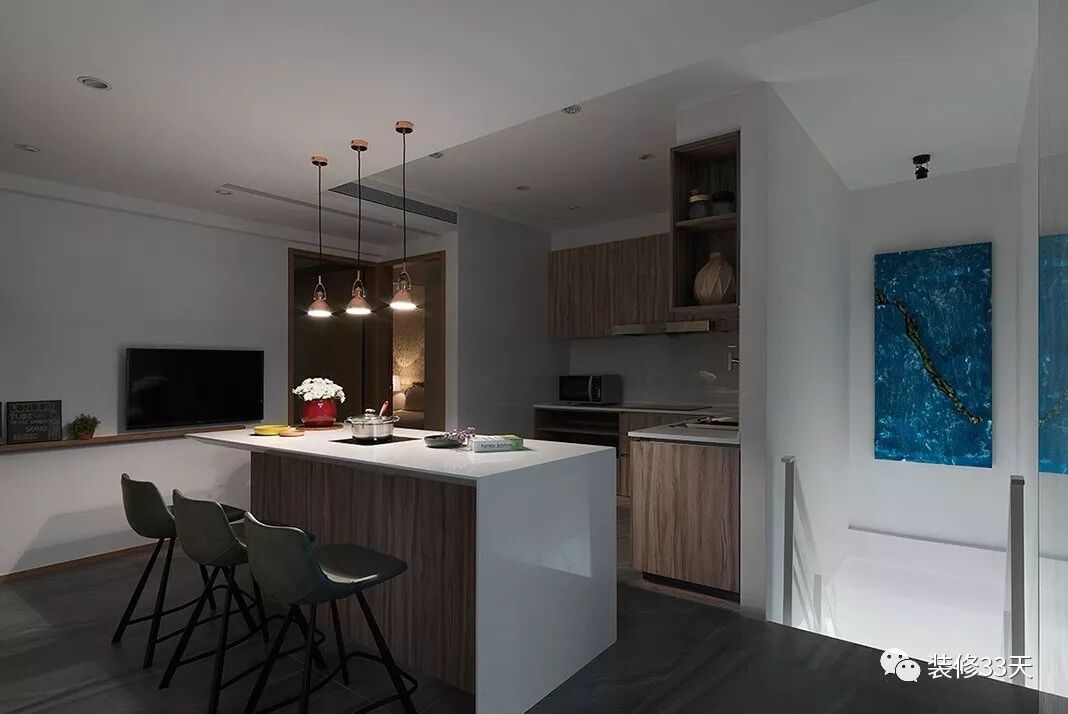 ▲ 餐厨区合一的设计,整合格局,规划出更加顺畅的动线,顺沿地下室的墙面装饰一幅抽象画,布置出空间端景