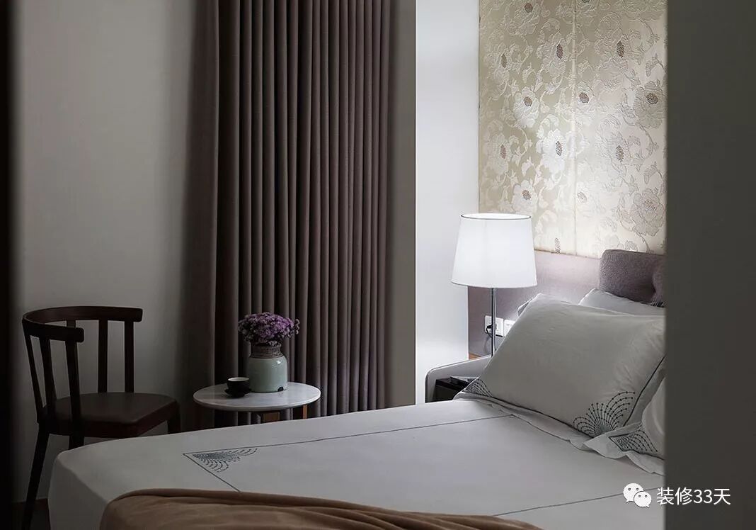 ▲ 次卧根据业主的喜好,铺贴优雅沁人的壁纸,搭配简洁舒适的床品,打造出舒眠静谧的就寝环境