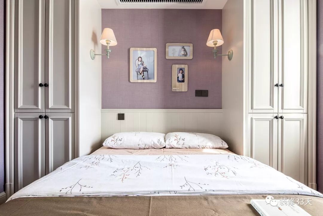 ▲ 白色护墙两边木作对称竖柜,用于空间收纳,点缀壁灯与写真,打造独一无二的背景墙