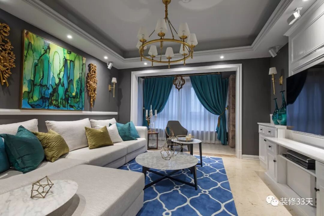 ▲ 客厅整体风格以混搭为主,采用灰白蓝为基调,加入流行彩绿色与金色元素点缀