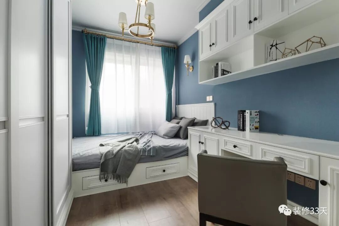 ▲ 次卧木作榻榻米和储物柜,书桌结合吊柜让空间兼具阅读功能,蓝白相搭清爽安静