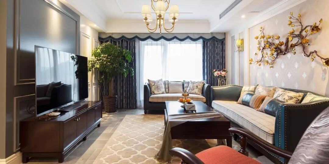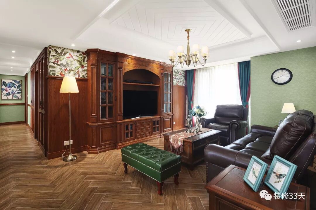 ▲ 客厅人字铺木纹砖搭配绿色调壁纸背景,保持整体空间一致性,回字造型吊顶装一盏美式吊灯,营造温馨氛围