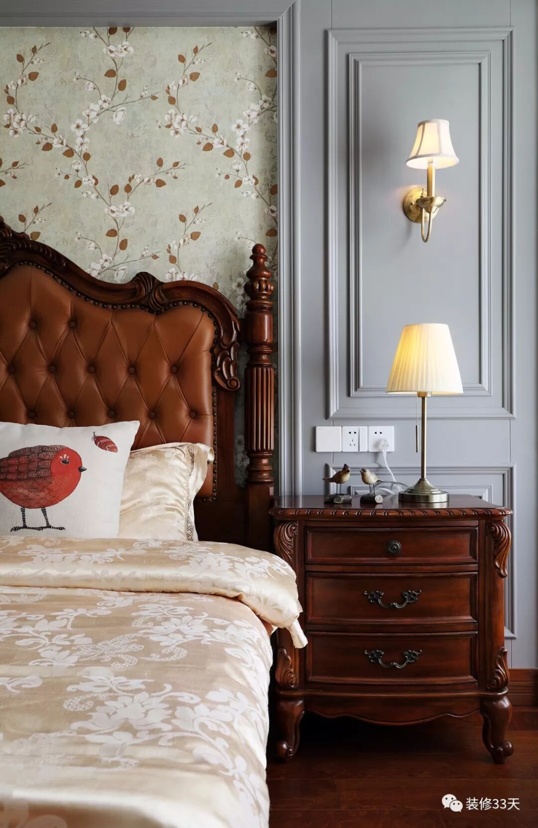 ▲ 主卧地面通铺深色木地板,雅致繁花墙纸搭配留白吊顶与灰色护墙背景,平衡出舒适视觉
