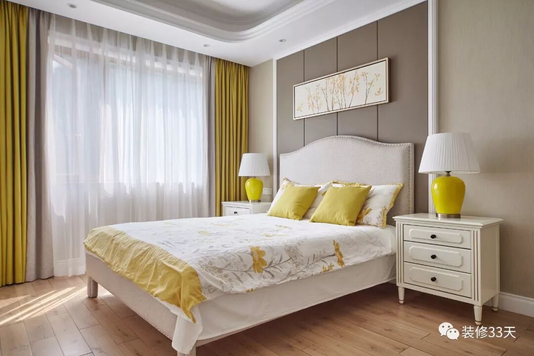 ▲ 主卧采用浅色护墙板搭配深灰色软包设计出层次感床背景,简欧款高背大床搭配对称床头柜,金色元素台灯增加精致细节