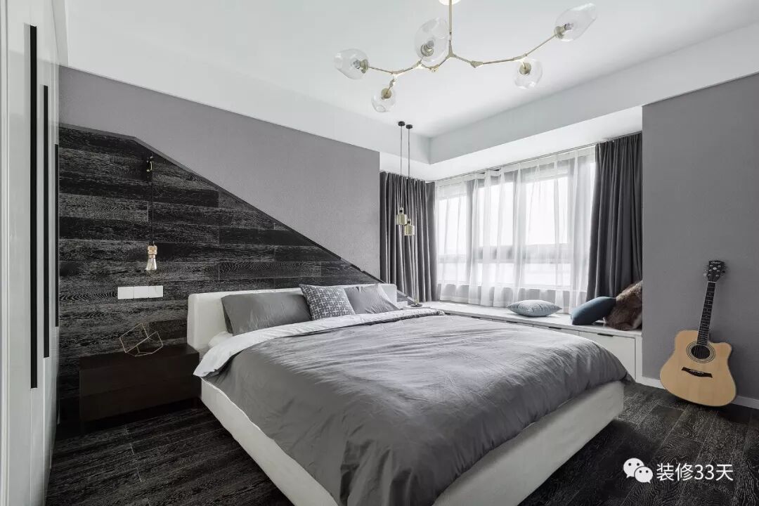 ▲ 主卧室原始建筑飘窗的位置导致背景并不完整,在设计背景时保留它原始的不对称感,做斜面的造型,用地板材质延伸到墙面