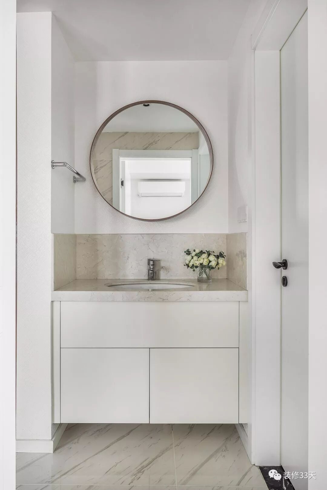 ▲ 卫生间干湿分区,简洁清爽的白色瓷砖,搭配金边圆形镜子,空间变得简洁且精致