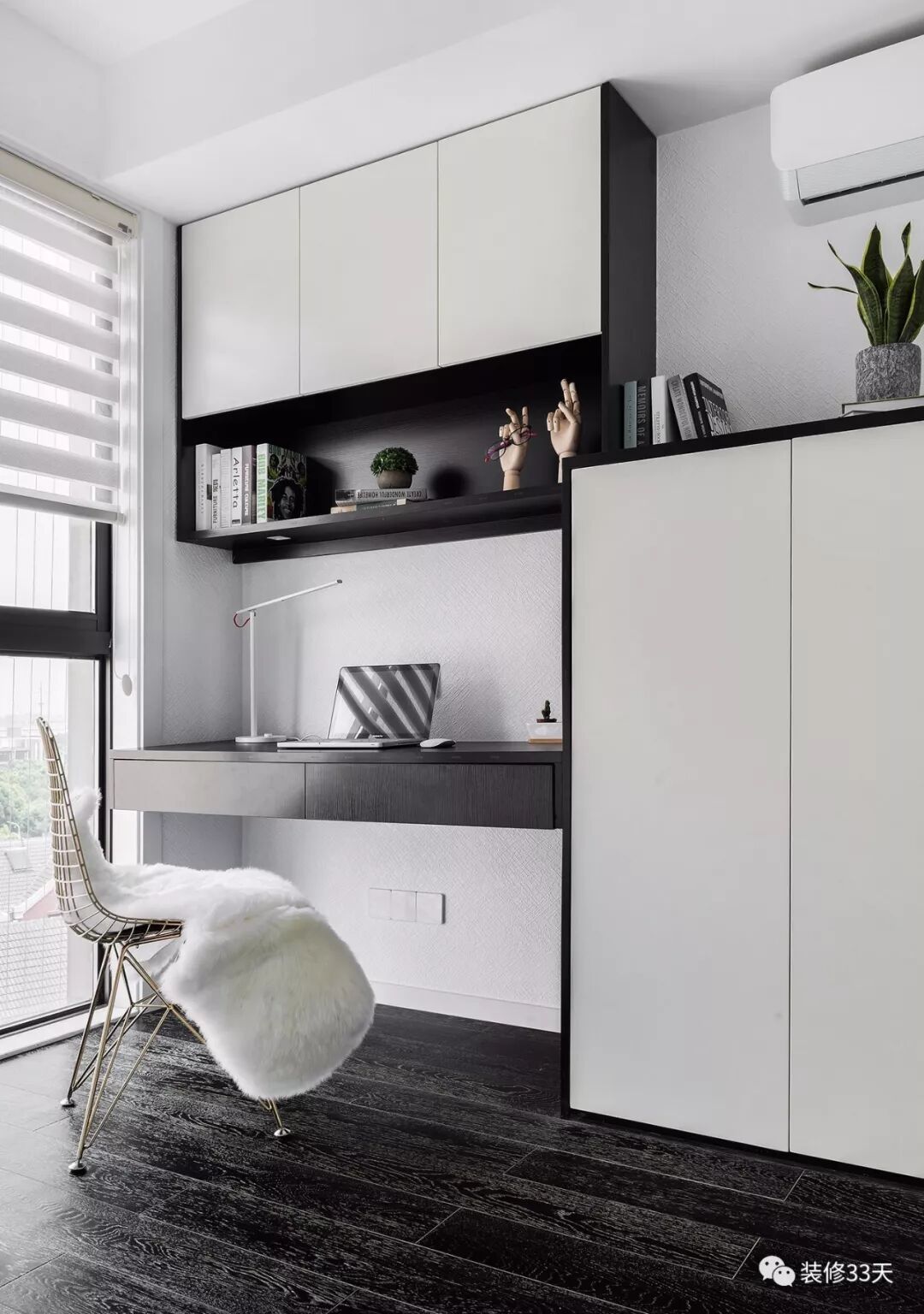 ▲ 书房通过低饱和度的色彩,收纳机能的柜体连接写字台,没有多余,繁杂的设计,且也不失格调