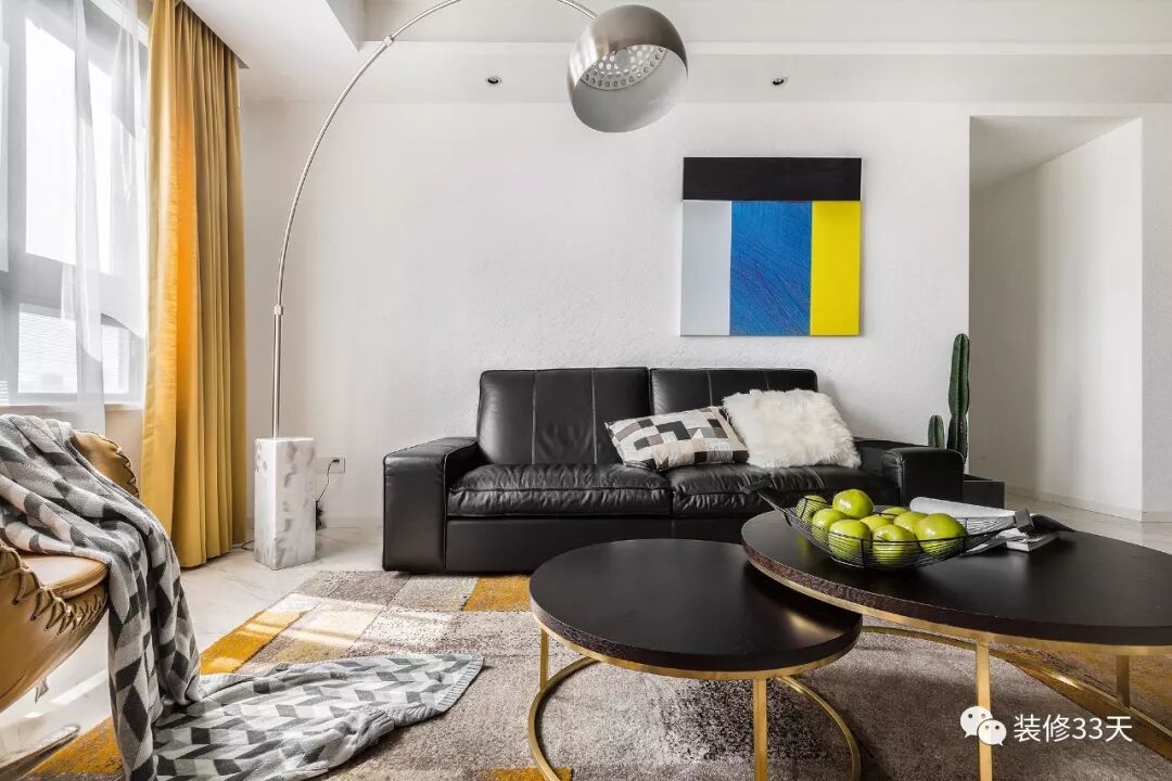 ▲ 跳跃的黄与主体的黑色相互调和,使得整体空间时尚,颇具品味,设计感十足的落地灯画龙点睛般给客厅增添了质感