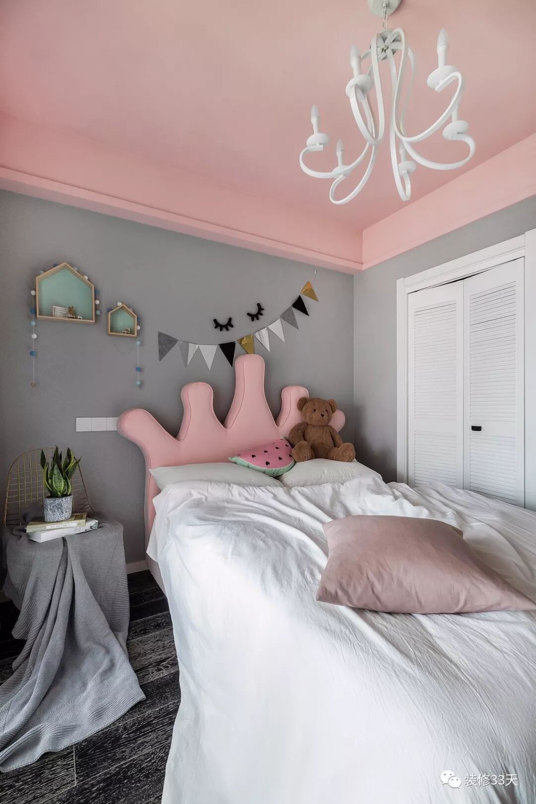 ▲ 儿童房是粉灰色的公主风,皇冠造型床,配上白色床品,点缀俏皮墙饰,不浮夸不落俗,更有高级感