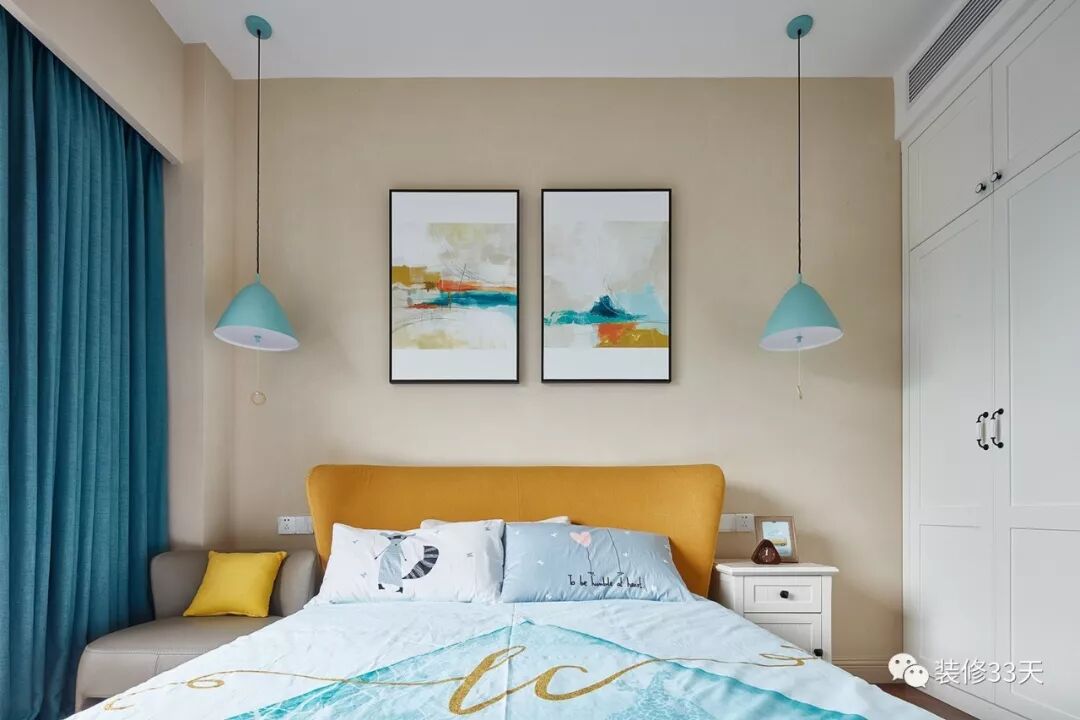 ▲ 儿童房用色青春明亮,搭配舒适的功能性家具,床背景两幅装饰画融汇室内色调