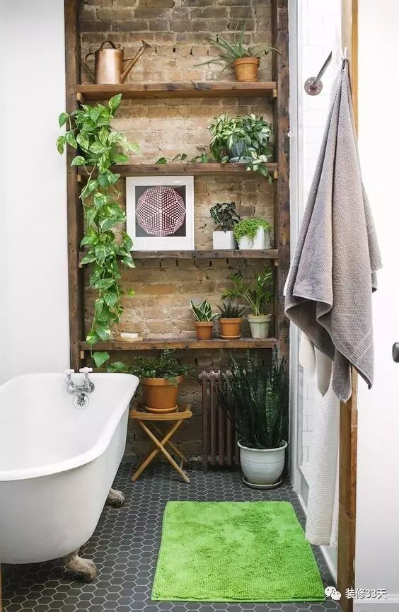 【浴室】:浴室湿度较高,非常适合蕨类植物的生长,如果有窗户透过一些散射光,那么常见的室内植物都可以选择。浴室空间较小,除了将小型盆栽放置在台盆、柜子等位置,也可以选择将植物悬挂起来。推荐:各种蕨类植物、绿萝、白掌、常春藤、吊兰⋯⋯